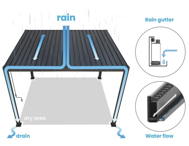 Крім того, вони забезпечують ідеальну циркуляцію повітря, створюючи приємну атмосферу під час використання. Продумана система водостоків відводить воду, що запобігає появі калюж. Представлена альтанка доступна в білому кольорі, що дасть їй змогу ідеально вписатися в стиль вашого саду.
