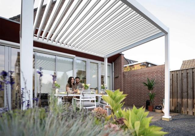 Рухомі сталеві рейки - ще одна перевага перголи, що дозволяє регулювати доступ світла. З їхньою допомогою ви зможете створити частковий або повний захист від сонця. А коли рейки встановлені горизонтально, навіс стає повністю водонепроникним, що дає змогу використовувати його і в дощові дні. Інноваційна система водостоків ефективно відводить воду, даючи змогу насолоджуватися садом навіть під час сильних дощів, завдяки чому насолоджуватися принадами відпочинку на свіжому повітрі можна в будь-яку погоду. Щоб підвищити комфорт відпочинку в альтанці, ви можете розглянути додаткові опції, які доступні за додаткову плату.