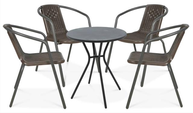 Конструкцію стільців виготовлено з міцної сталі з порошковим покриттям коричневого кольору, що надає меблям сучасного та стильного вигляду. Сидіння і спинки стільців виготовлені з єдиного формованого пластику з текстурою натурального ротанга, що робить їх довговічними і легкими у догляді. Комплект балконних меблів Focus Garden Simple 4+1 ідеально підходить як для маленьких, так і для великих балконів. Стільці легко штабелюються для зручності зберігання та економії місця.