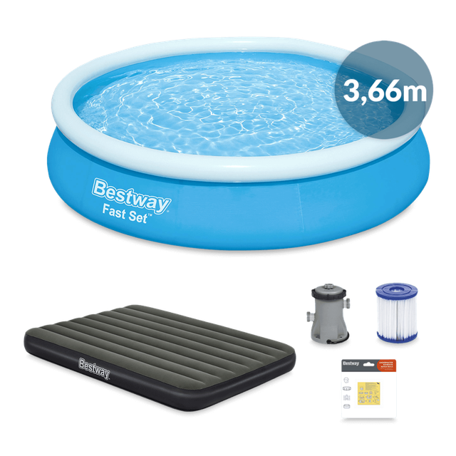 - Круглий надувний басейн - 3,66 х 76 см - Круглий надувний басейн Fast Set вражаючих розмірів 3,66 х 76 см - ідеальний вибір для всієї родини. Завдяки інноваційній технології Bestway басейн надзвичайно простий в установці - досить надути його і налити воду. Міцні багатошарові стінки з ПВХ забезпечують довговічність і стійкість, а спеціальна технологія Fast Set змушує басейн автоматично підніматися в міру наповнення водою. Тепер ви можете без зайвих складнощів насолоджуватися прохолодою в спекотні літні дні!
