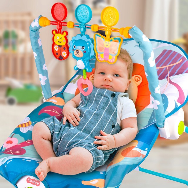 - Крісло-гойдалка має знімну перекладину для іграшок, яку можна розмістити спереду або ззаду дитини.