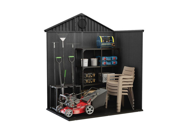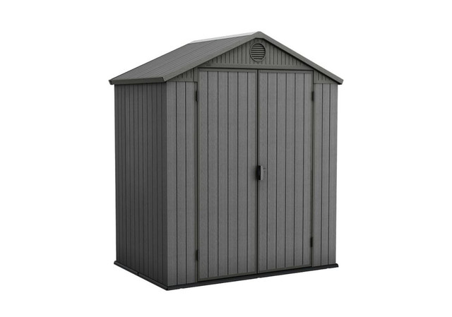 Садовий будинок Darwin 6x4 Графіт від бренду Keter оснащений вентиляційними отворами та вікном, що позитивно впливає на комфорт використання продукту. Двостулкові двері дають змогу легко вносити в садовий будинок інструменти та обладнання великого розміру, наприклад, газонокосарку. Перевагою продукту є можливість закривання дверей на додатковий замок, що дає змогу захистити збережене обладнання від крадіжки або пошкодження.