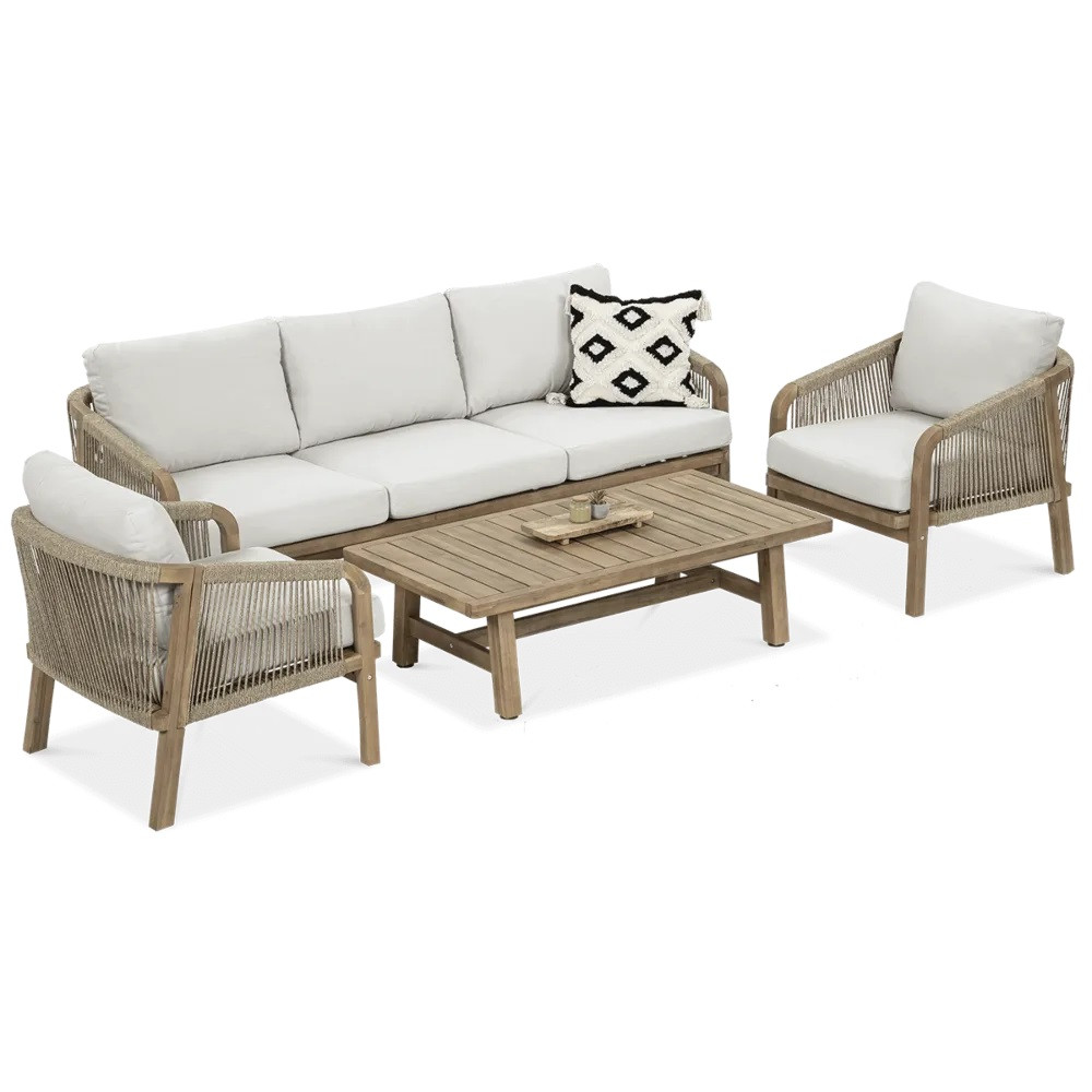 Комплект дерев'яних меблів Furrore Maridgold Coffe складається з двох зручних крісел, привабливого тримісного дивана і дерев'яного журнального столика довжиною 127.5 см. Комплект доповнений щільними м'якими подушками з лляної тканини світло-бежевого відтінку. Комплект ідеально вписується в природний декор тераси, саду чи оранжереї. Це ідеальна пропозиція для людей, які цінують відпочинок на природі та хочуть мати у своєму саду унікальний набір меблів.
